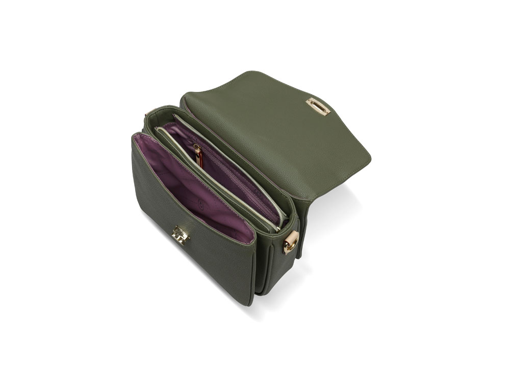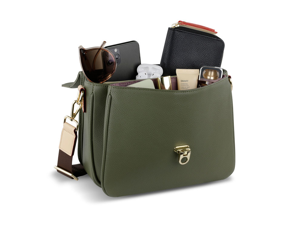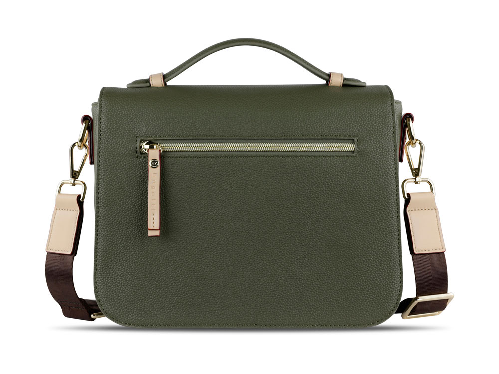 Внешняя организация: застёжка-клапан, задний карман на молнии, съёмный регулируемый ремень (до 130 см)