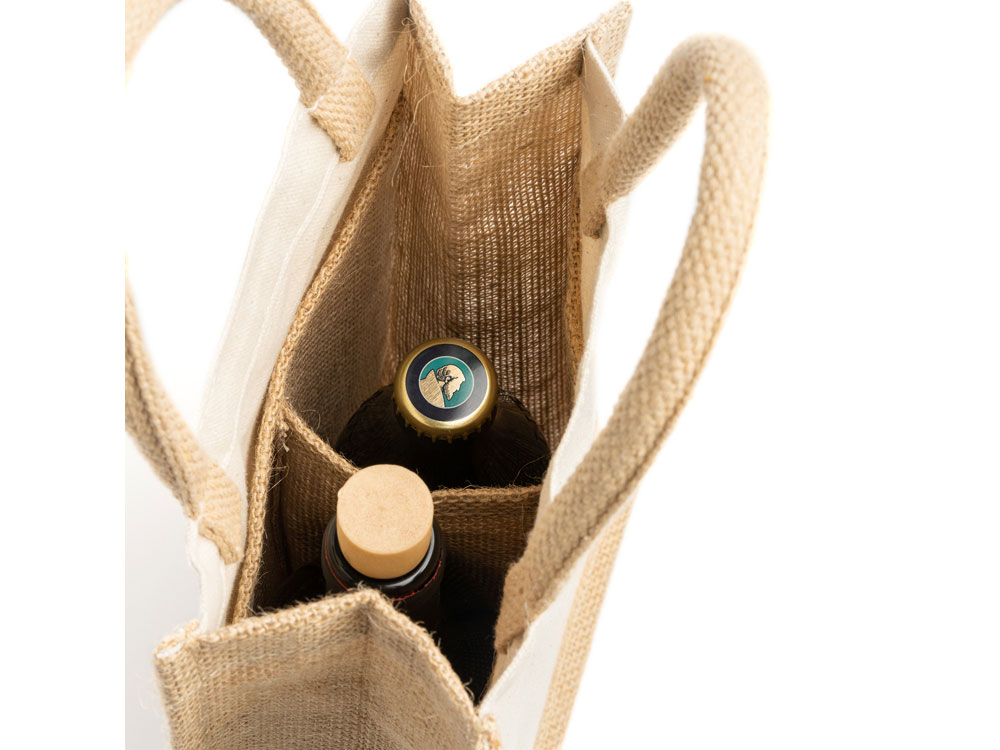Сумка из ламинированного джута и хлопка. Двойное отделение и усиленные ручки. Идеально подходит для двух бутылок.