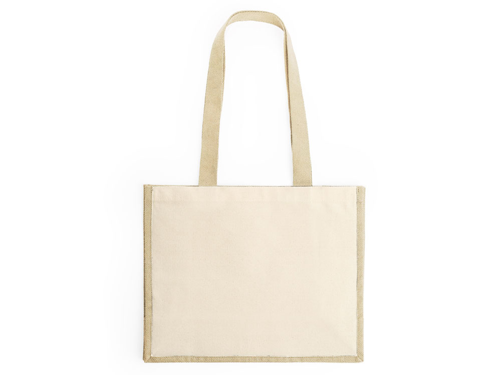 Сумка из ламинированного джута с длинными ручками и хлопковыми боковыми сторонами. Идеально подходит для нанесения.