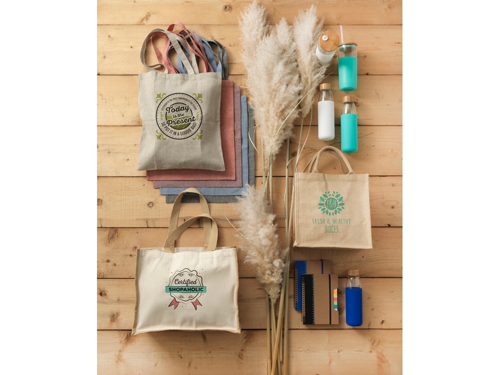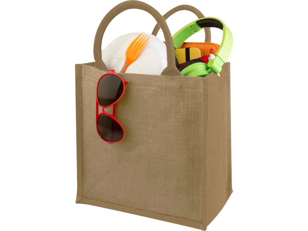 Джутовая подарочная сумка Chennai. Джутовая сумка с ламинированным открытым основным отделением и вставкой. Хлопковые ручки высотой 11,5 см. Джут. Термотрансфер (1 цвет (цветные изделия)) на данный товар осуществляется бесплатно. Оплачивается только настройка оборудования в размере 9200 рублей на весь тираж.