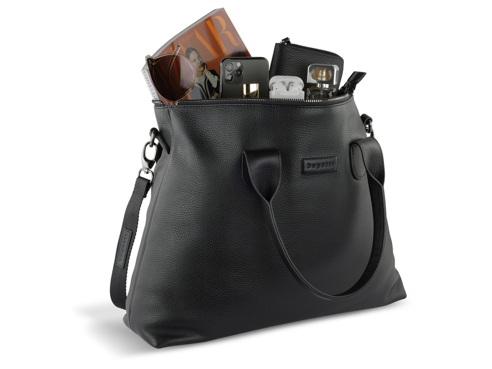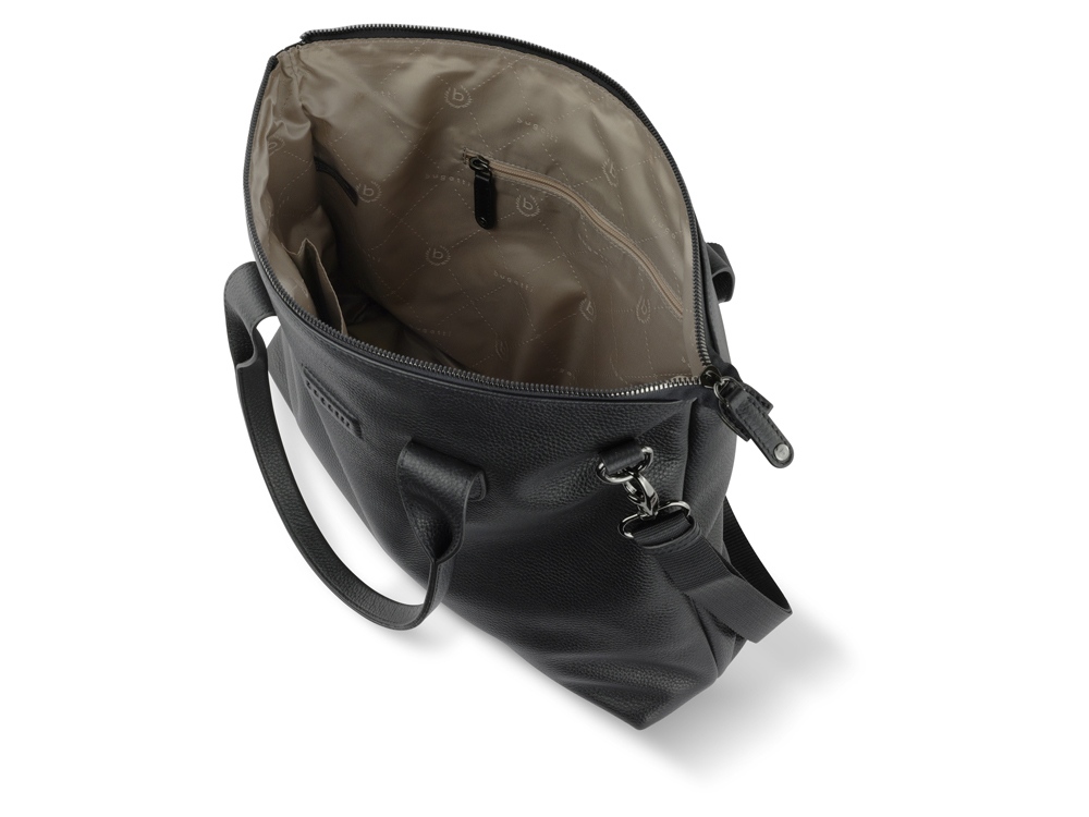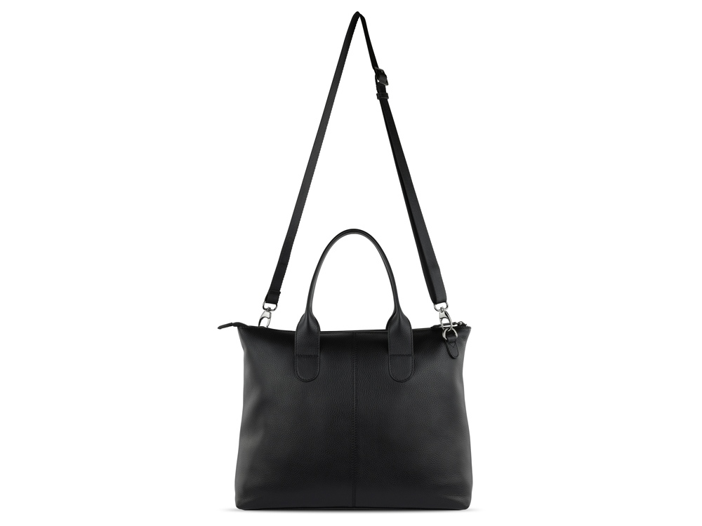 Функциональная организация: основное отделение на молнии с карманом на молнии, 2 открытых кармана, задний карман на молнии, 2 ручки, съемный регулируемый плечевой ремень (до 130 см).