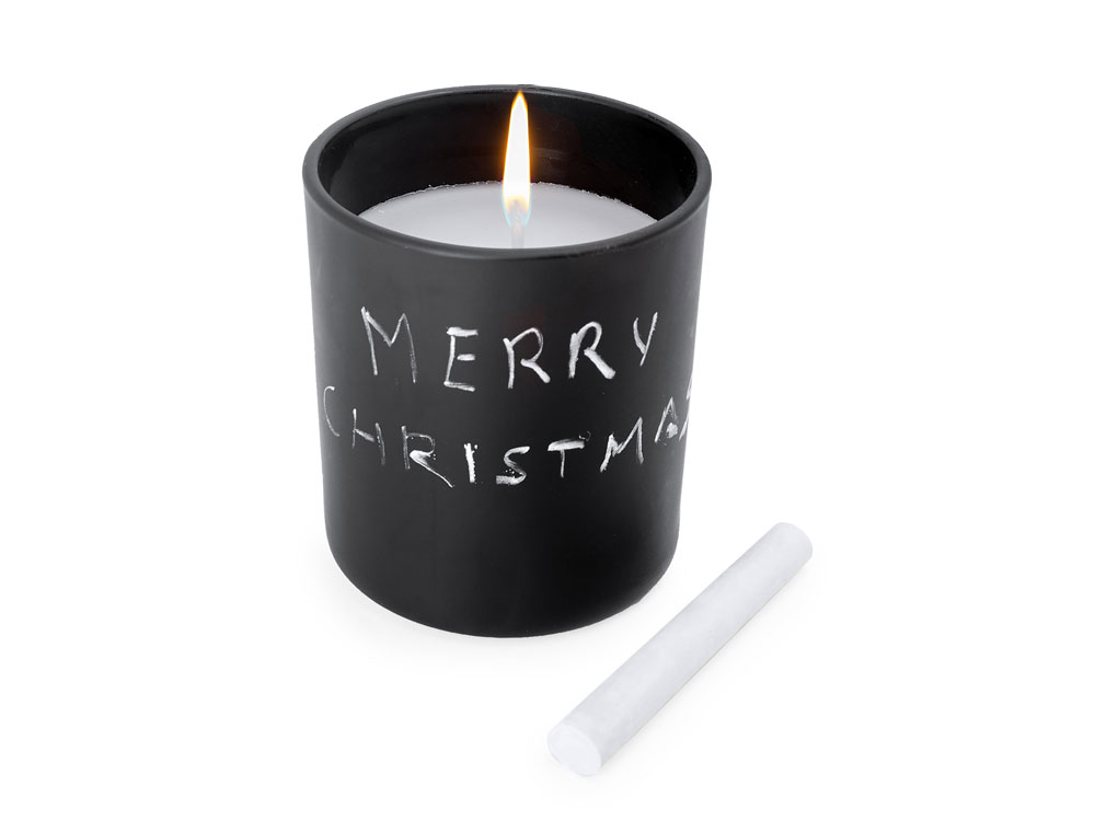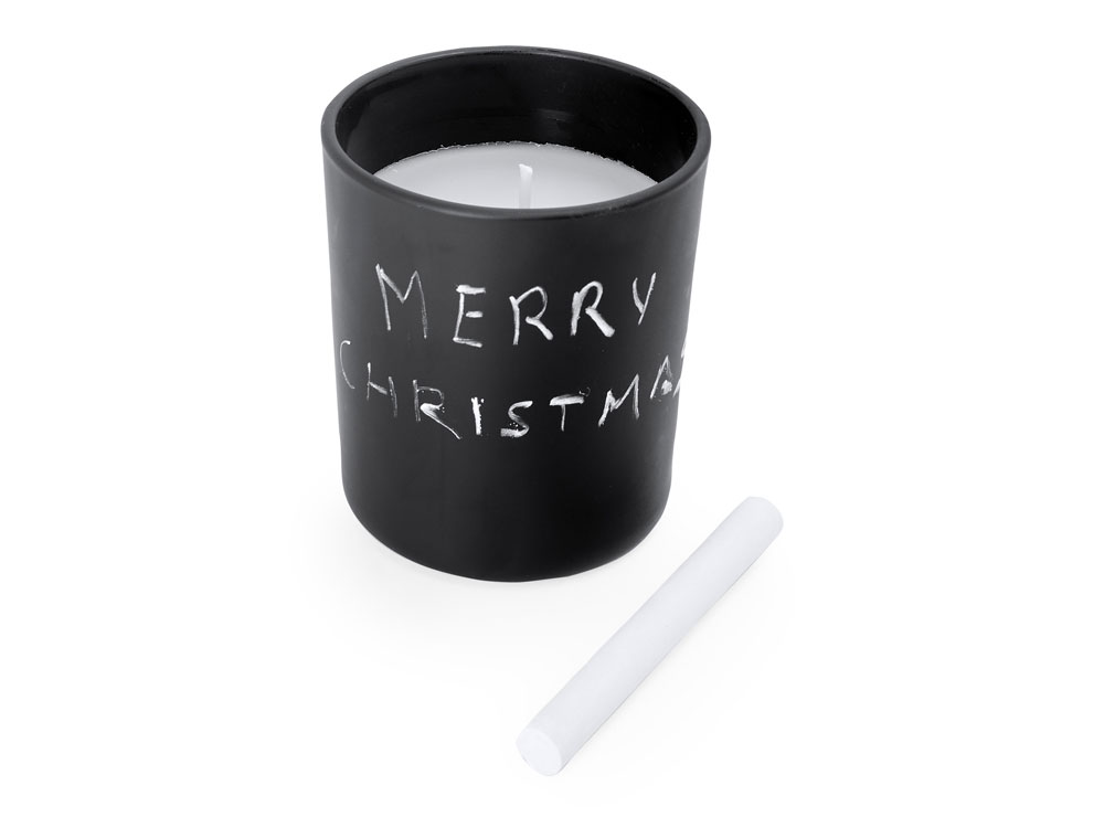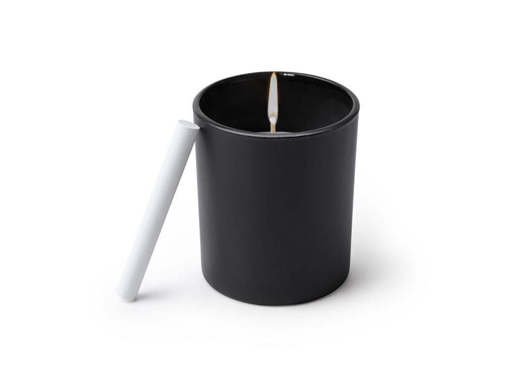 Ароматическая свеча в круглом черном керамическом подсвечнике. В комплект входит мел для рисования на подсвечнике. Белая свеча и фитиль. Аромат ванили. Цифровая печать (наклейка на белой пленке) на данный товар осуществляется бесплатно. Оплачивается только настройка оборудования в размере 1000 рублей на весь тираж.