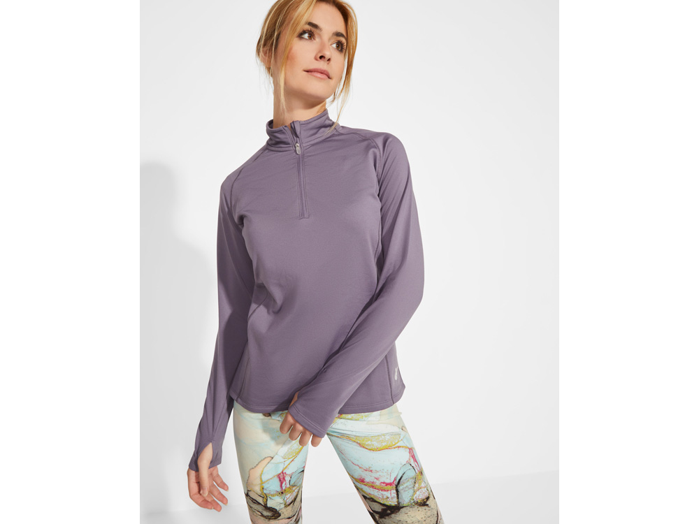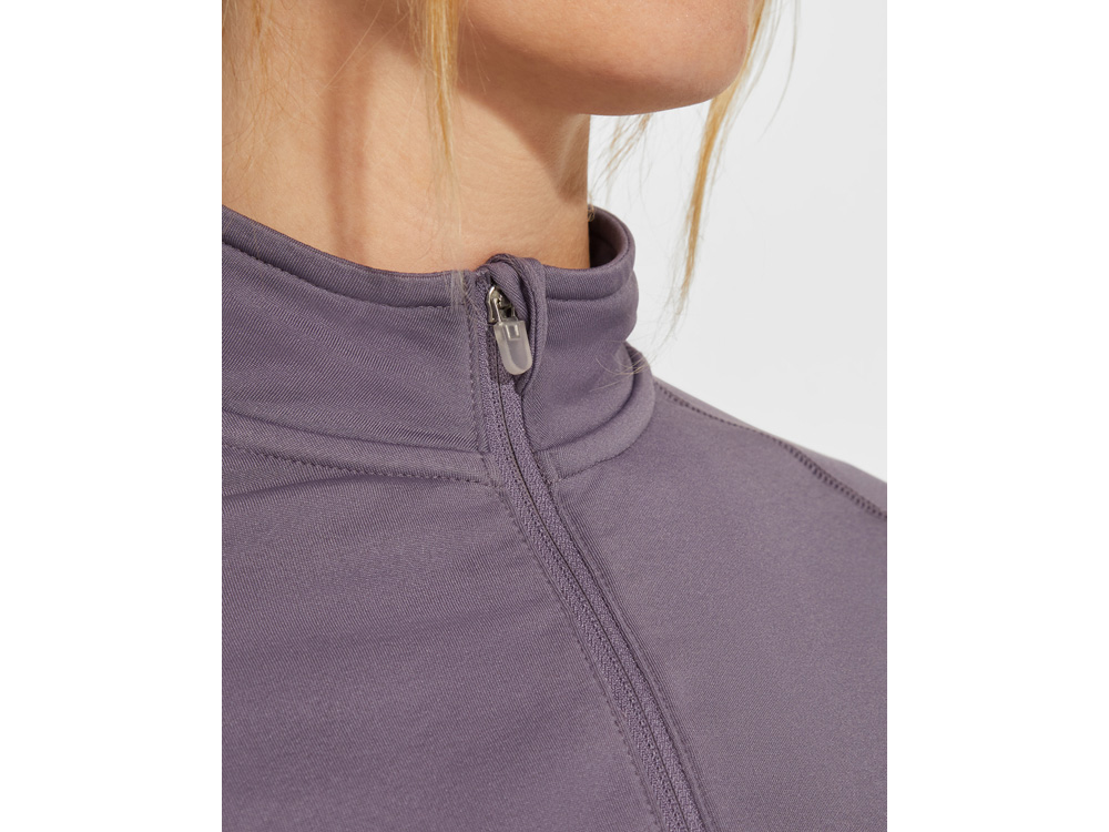 Техническая женская толстовка с длинным рукавом реглан. Подкладка из плюшевого трикотажа. Усиленные закрытые швы по воротнику. Перевернутая застежка·молния со светоотражающими деталями. Отверстие для большого пальца на манжетах. Отстрочки по рукавам и боковым вставкам. Светоотражающий логотип Roly на левой боковой вставке.