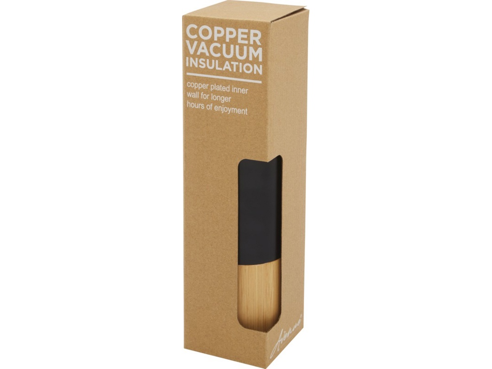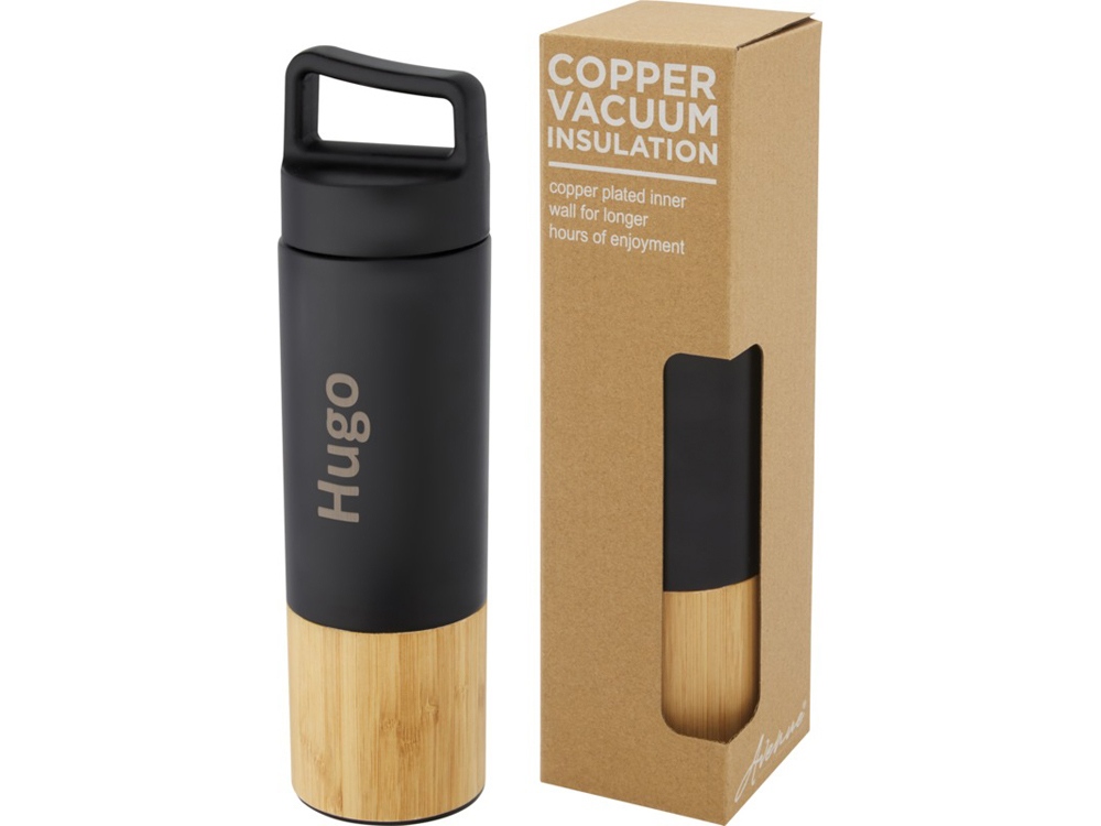 Бутылка из нержавеющей стали 18/8 с медной вакуумной изоляцией сохраняет напитки горячими или холодными в течение нескольких часов. Имеет модный элемент из бамбука; бутылку легко носить с собой благодаря ручке на верхней части крышки. Бутылка имеет широкое горлышко, поэтому ее легко наполнять и мыть. Протестировано и одобрено согласно немецкому законодательству о безопасности пищевых продуктов (LFGB), а также проверено на содержание фталатов согласно нормам REACH. Объем 540 мл. В коробке из переработанного картона. Нержавеющая сталь, бамбук.