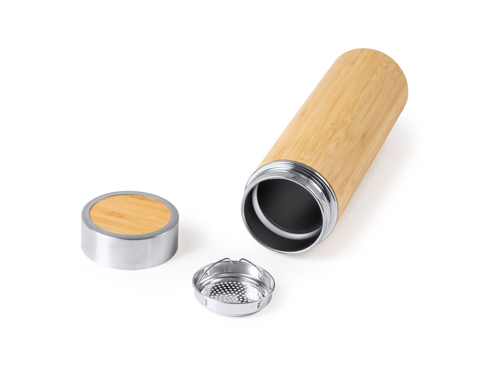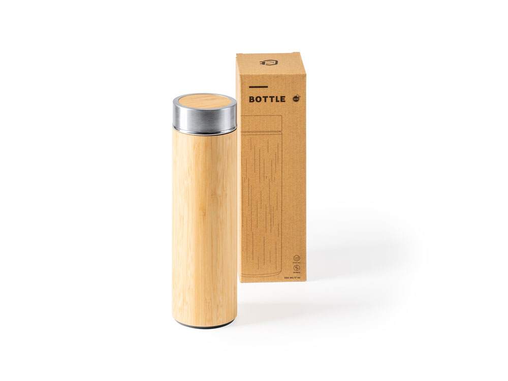 Бутылка из нержавеющей стали с двойными стенками, завинчивающейся крышкой и съемным внутренним фильтром. Внешняя стенка из натурального бамбука. Емкость 500 мл.