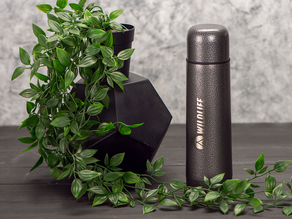 Универсальный термос с уникальным покрытием «Hammer». Необычное рельефное покрытие защищает термос от внешних повреждений, а также способствует надежному хвату даже в перчатках. Благодаря вакуумной изоляции и двойным стенкам сохраняет напитки горячими более 6 часов, а теплыми — в течение 24 часов. Герметичный клапан открывается и закрывается по легкому нажатию. Термос поставляется в дорожном чехле из искусственной кожи. Гравировка (CO2 лазер) (Без чернения) на данный товар осуществляется бесплатно. Оплачивается только настройка оборудования в размере 1000 рублей на весь тираж.