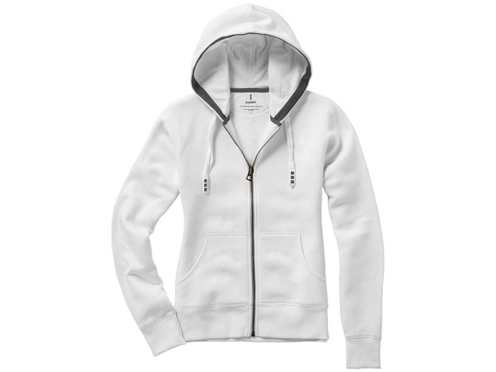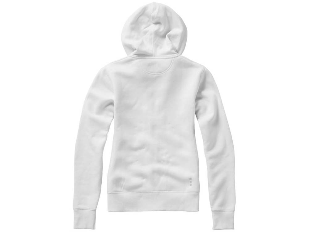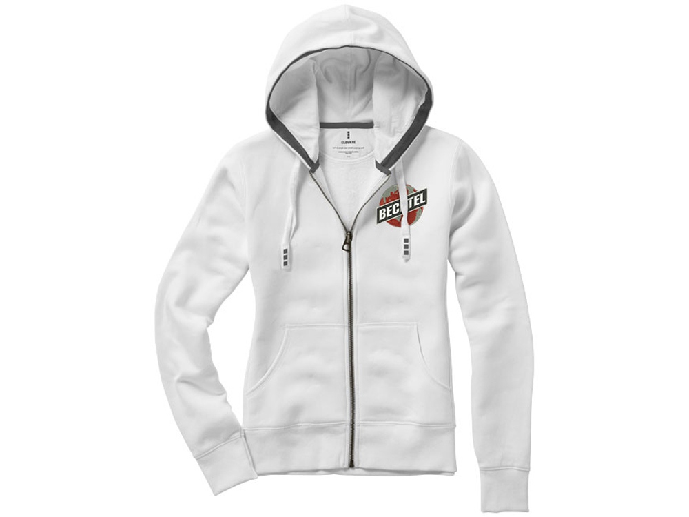 Женский свитер Arora с капюшоном и застежкой-молнией на всю длину. Стандартный покрой. Резинка 2х2 на боковых вставках, поясе и манжетах. Карман кенгуру. Мужская и женская модели с завязками на капюшоне. Подкладка внутри капюшона. Атласная лента внутри горловины. Принт лого сзади в тон изделия. Серебристые люверсы с лого. Ворсистый внутри для мягкости, тепла и комфорта. Трикотаж: 80% хлопок и 20% полиэстер, чесаная внутренняя сторона. 300 г/м². Трафаретная печать (1 цвет (цветные изделия)) на данный товар осуществляется бесплатно. Оплачивается только настройка оборудования в размере 8700 рублей на весь тираж.