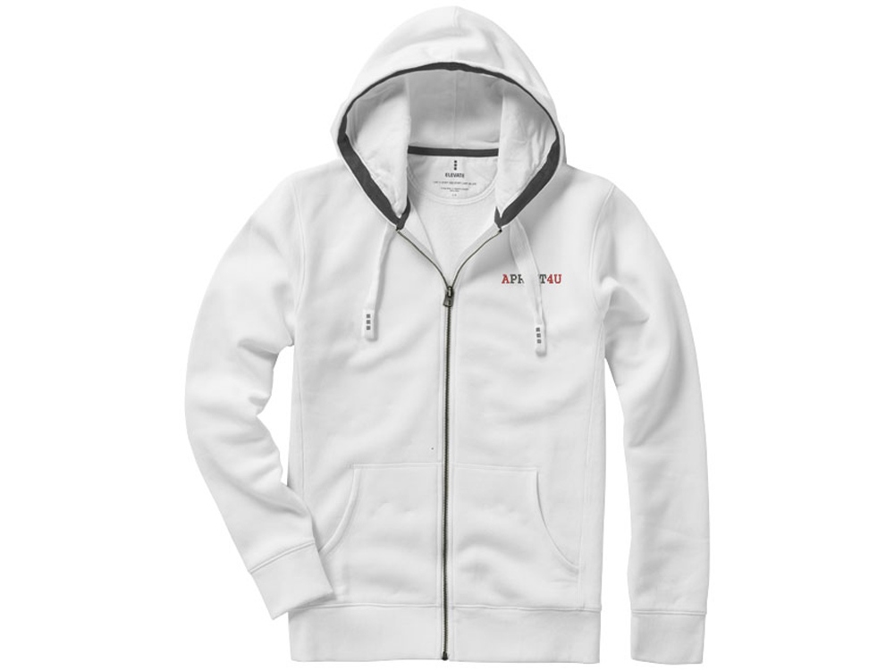 Свитер Arora с капюшоном и застежкой-молнией на всю длину. Стандартный покрой. Резинка 2х2 на боковых вставках, поясе и манжетах. Карман кенгуру. Мужская и женская модели с завязками на капюшоне. Подкладка внутри капюшона. Подкладка на полумесяце. Атласная лента внутри горловины. Принт лого сзади в тон изделия. Серебристые люверсы с лого. Трикотаж: 80% хлопок и 20% полиэстер, чесаная внутренняя сторона. 300 г/м². Трафаретная печать (1 цвет (цветные изделия)) на данный товар осуществляется бесплатно. Оплачивается только настройка оборудования в размере 8700 рублей на весь тираж.