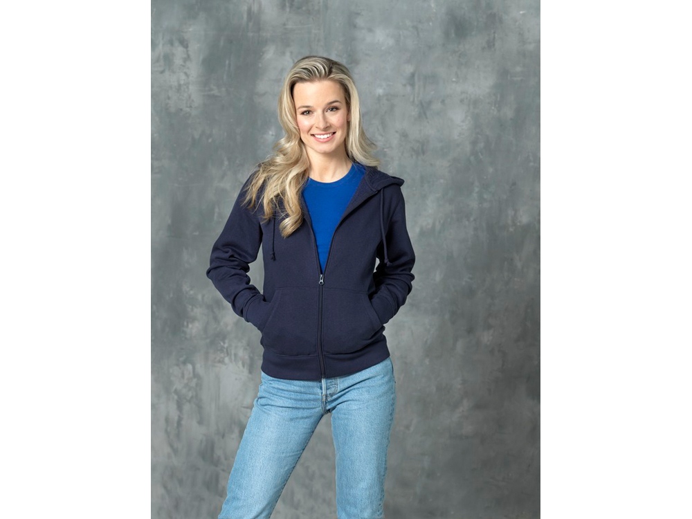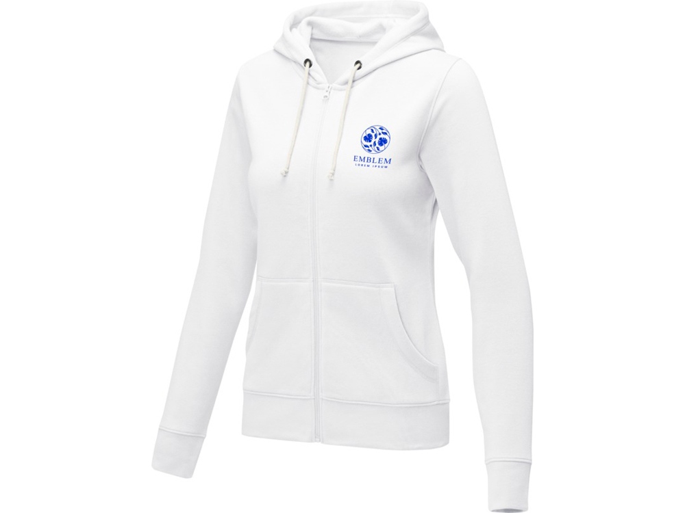 Женская толстовка на молнии Theron. Основная этикетка, которую можно оторвать или отрезать, без неудобных пришитых ярлыков. Завязки на капюшоне. Расположенная по центру молния. Карман «кенгуру». С подшивкой из гладкого трикотажа в рубчик. С манжетами из гладкого трикотажа в рубчик. Внутренняя сторона покрыта ворсом. Тесьма из основного материала по внутренней стороне горловины. Придающие форму швы и зауженная талия для ровного прилегания. Трикотаж 50% Хлопок, 50% Полиэстер, 240 g/m2. Трафаретная печать (1 цвет (белые изделия)) на данный товар осуществляется бесплатно. Оплачивается только настройка оборудования в размере 5300 рублей на весь тираж.