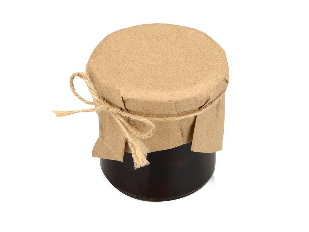 Банка варенья обернута крафт-бумагой, на которую возможно сделать нанесение корпоративного логотипа. Цифровая печать (наклейка на белой пленке) на данный товар осуществляется бесплатно. Оплачивается только настройка оборудования в размере 1000 рублей на весь тираж.