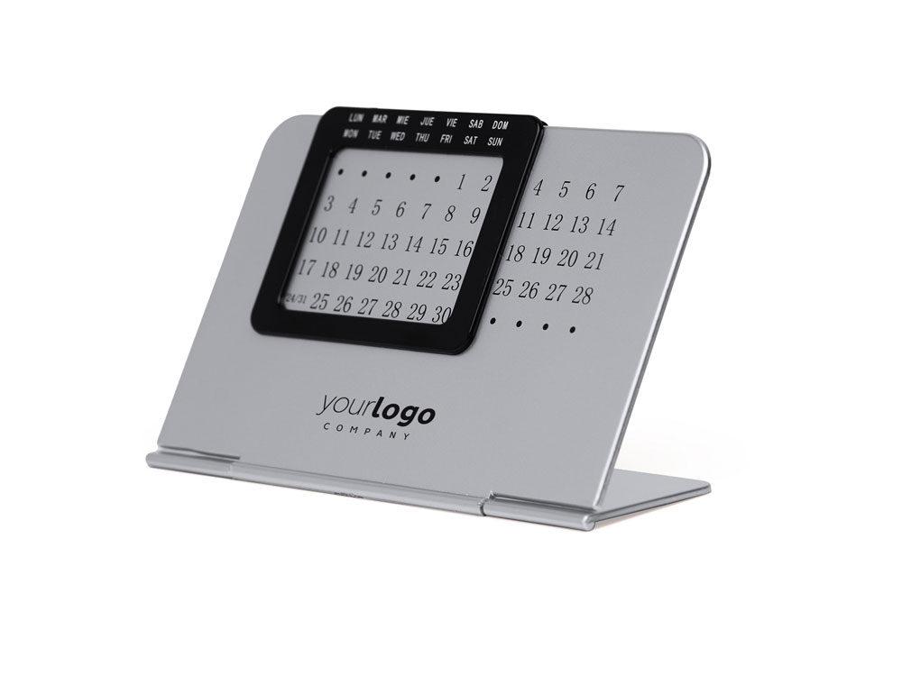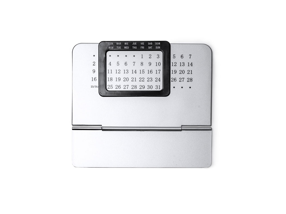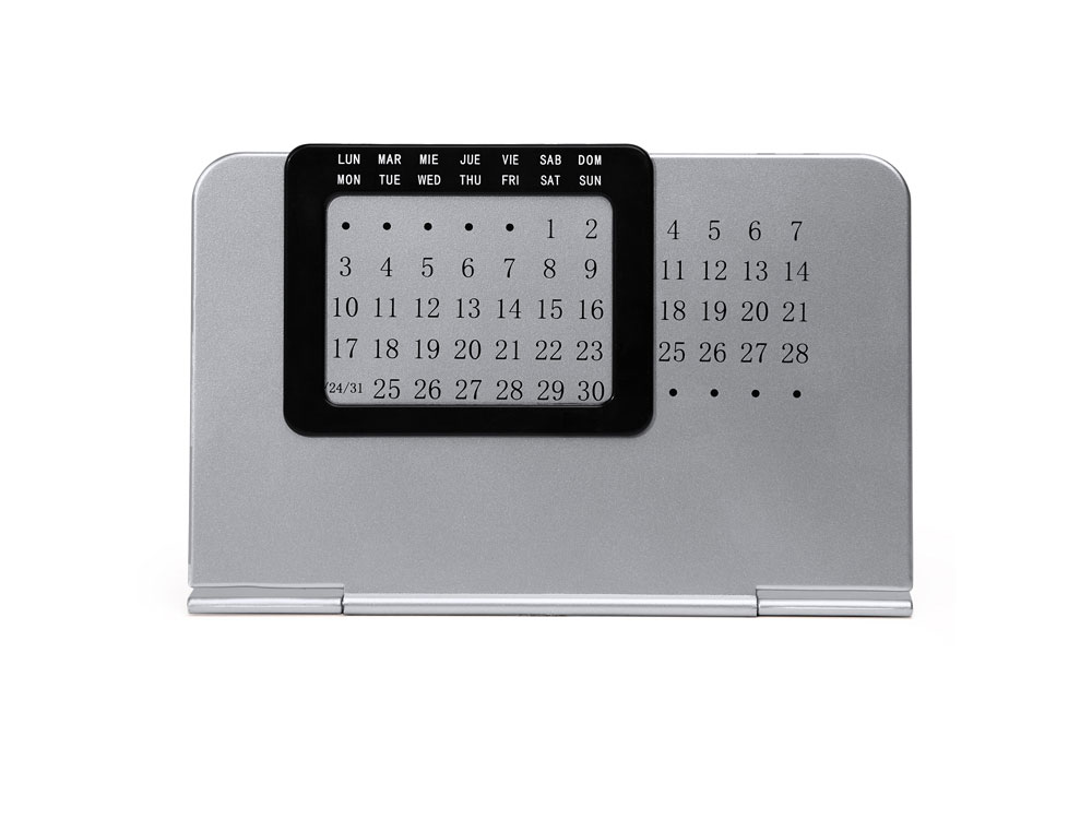 «Вечный» настольный календарь, состоящий из двух частей: одной серебряной подставки с числовой панелью и черной выдвижной рамки с днями недели на испанском и английском языках.