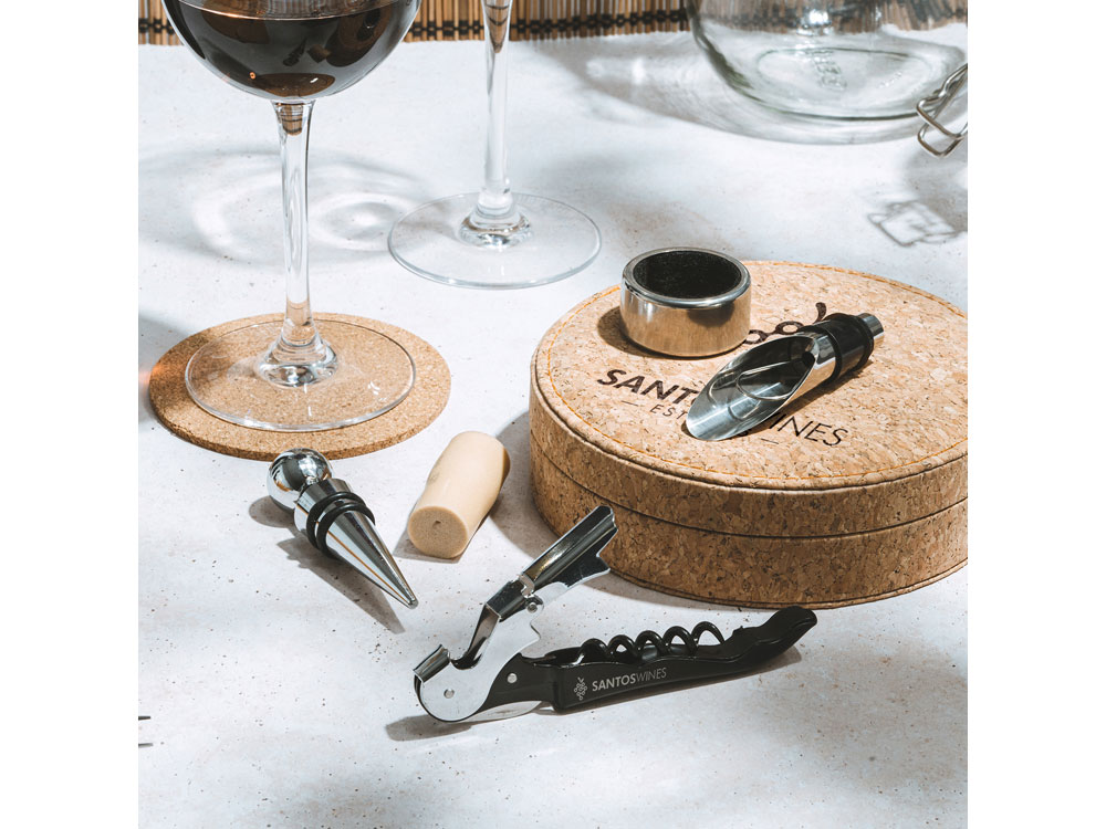Винный набор с аксессуарами из нержавеющей стали, штопор, каплеуловитель, дозатор и пробка.