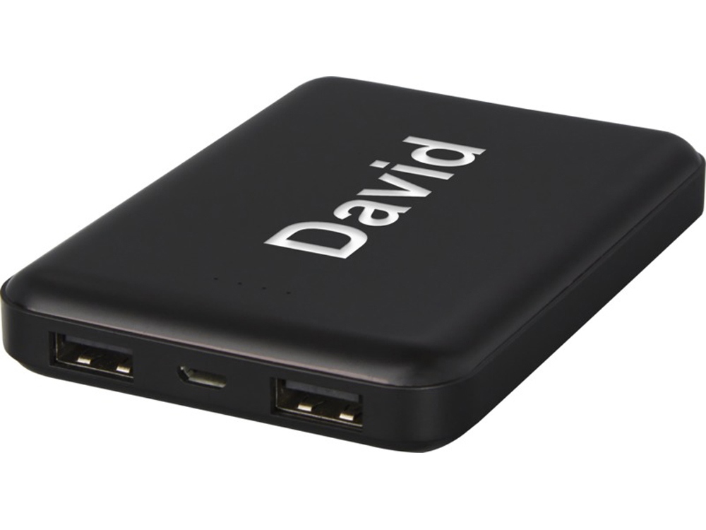 Плоское и надежное портативное зарядное устройство с полимерным аккумулятором емкостью 5000 мАч. На переднюю панель можно нанести лазерную гравировку, которая при включении портативного зарядного устройства или его использовании будет подсвечивать логотип. Выходная мощность: 5 В/2 А. Входная мощность: 5 В/2 А. Для обеспечения устойчивости вспомогательные кабели не предусмотрены.