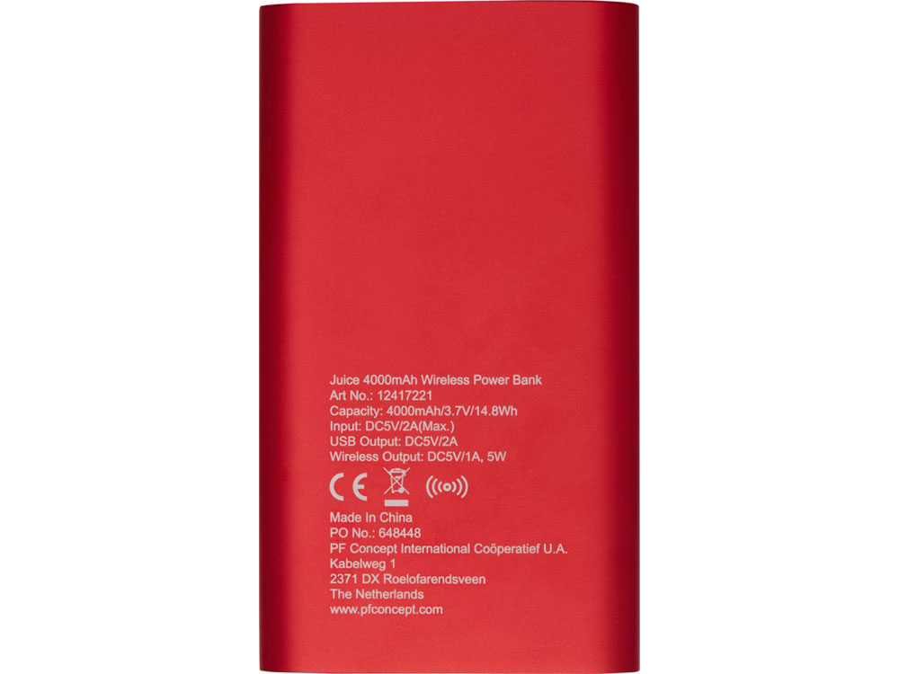 Портативное зарядное устройство емкостью 4000 мАч с алюминиевым корпусом. Поддерживает беспроводную зарядку мощностью 5 Вт, а также имеет выход Micro USB для зарядки с помощью кабеля. Благодаря литий-полимерному аккумулятору емкостью 4000 мАч может зарядить смартфон до полного заряда. Индикатор питания, постоянно показывающий уровень энергии. Встроенный порт Micro USB: Выход 5V/2A: 5 В/2 А. Выходная мощность беспроводной зарядки 5W. В комплект входит кабель для зарядки из TPE-пластика без ПВХ. Алюминий, Пластик ABS.