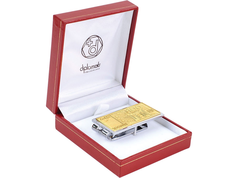 Стильный зажим для денег в серебряно-золотистой цветовой гамме отлично подойдет в качестве подарка успешному мужчине и партнерам по бизнесу. Зажим украшен изображением купюры номиналом в 100 Евро. В комплекте прилагается подарочный футляр.